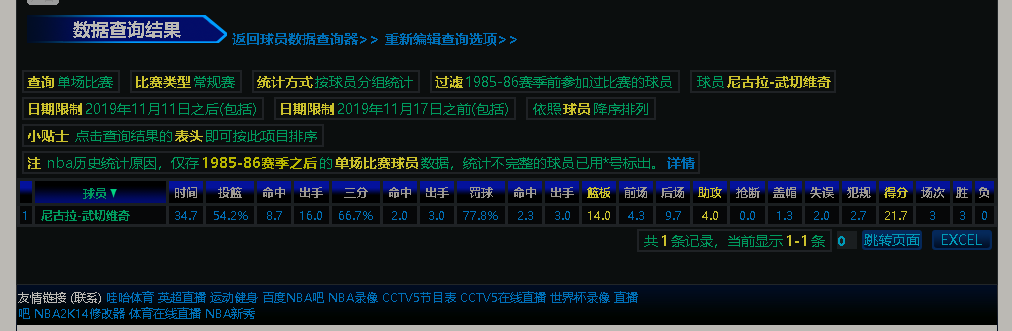 这里可以看到每个赛季的周最佳球员。然后每个球员旁边有个数据的链接,表示的就是这名球员当周的平均数据。比如11月11日-11月17日的东部周最佳是武切维奇,其数据链接为http://www.stat-nba.com/player/3672.html